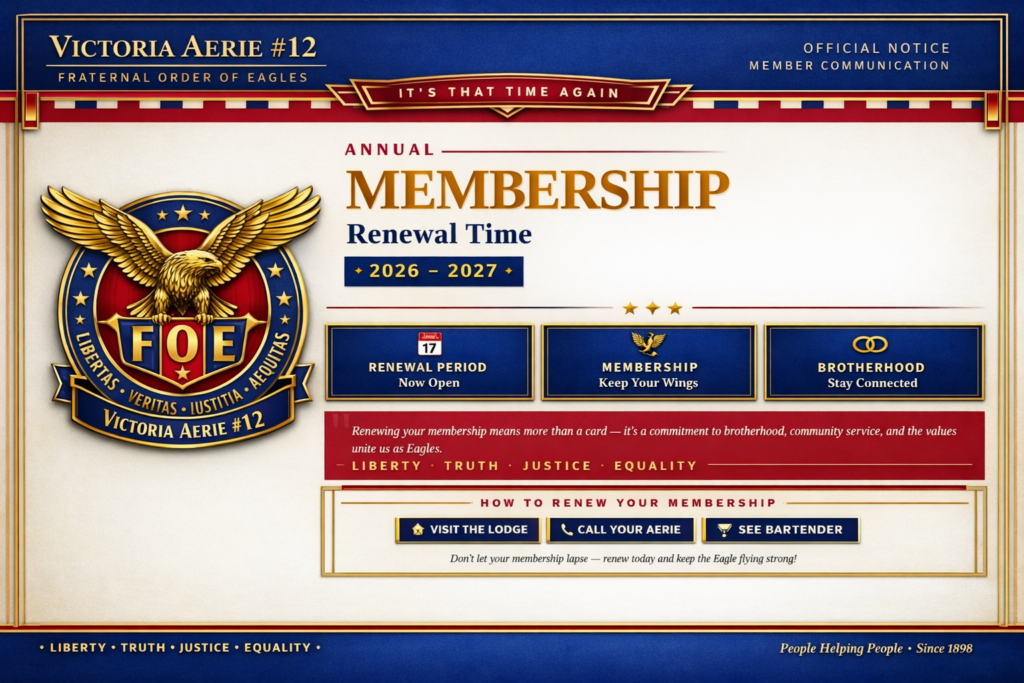 The Fraternal Order of Eagles is a community service and social club. Our theme is “People Helping People”. We are a membership-based organization that operates a social lounge, holds club events, and helps to better our community through fund-raising for worthy causes.